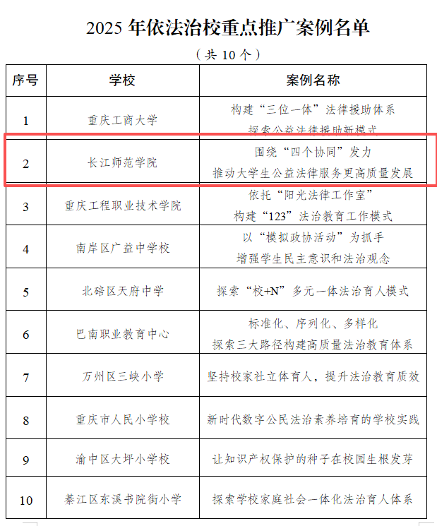 近日,重庆市教育委员会发布《关于公布2025年依法治校特色案例的通知》,我校报送的《围绕四个协同发力推动大学生公益法律服务更高质量发展》案例,成功入选市级依法治校重点推广典型案例。此次评选全市仅遴选10项重点推广案例,其中普通本科高校仅2所。