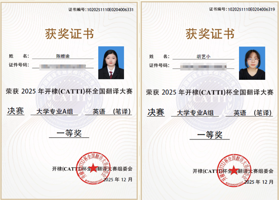 近日,2025年开棣(CATTI)杯全国翻译大赛结果正式公布,我校学子陈赠谕、胡艺在大学专业A组笔译赛道双双荣获全国一等奖。