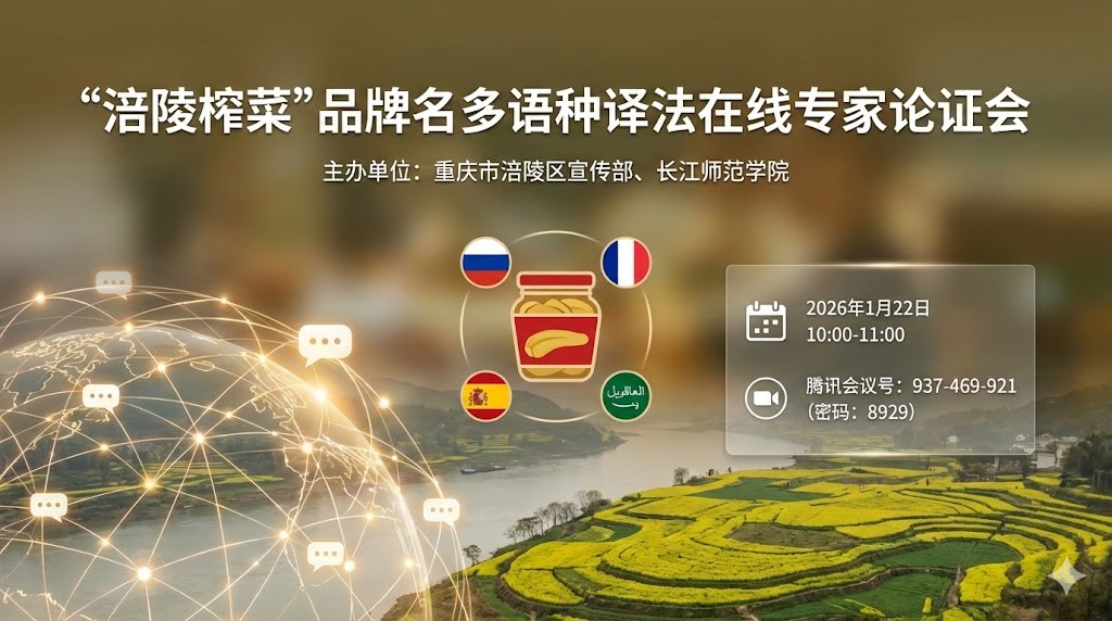 1月22日上午,由重庆市涪陵区委宣传部与我校联合主办的“涪陵榨菜”品牌名多语种译法在线专家论证会召开。来自南京大学、北京外国语大学、上海外国语大学、广东外语外贸大学和四川外国语大学等高校的8位翻译与传播领域专家,涪陵区委宣传部、区农业农村委、商务委、榨菜产业发展中心、榨菜集团等相关单位负责人,及我校外国语学院相关专业教师共同参加线上会议,聚焦涪陵榨菜在俄语、法语、西班牙语、阿拉伯语等小语种市场的品牌译名问题,助推地方品牌国际化,共谋翻译与传播新路径。