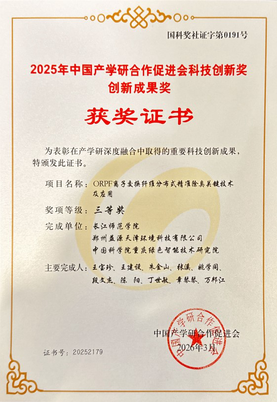 近日,我校绿色智慧环境学院王宝珍副院长牵头完成的“ORPF离子交换纤维分布式精准除臭关键技术及应用”项目,荣获2025年产学研合作创新成果奖三等奖。