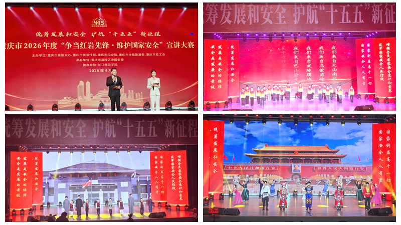 4月13日,由市委国安办、市委宣传部、市国安局、市文化旅游委、市总工会联合主办,涪陵区委国安委承办,我校协办的重庆市2026年度“争当红岩先锋 • 维护国家安全”宣讲大赛决赛在我校拏云活动中心举办。